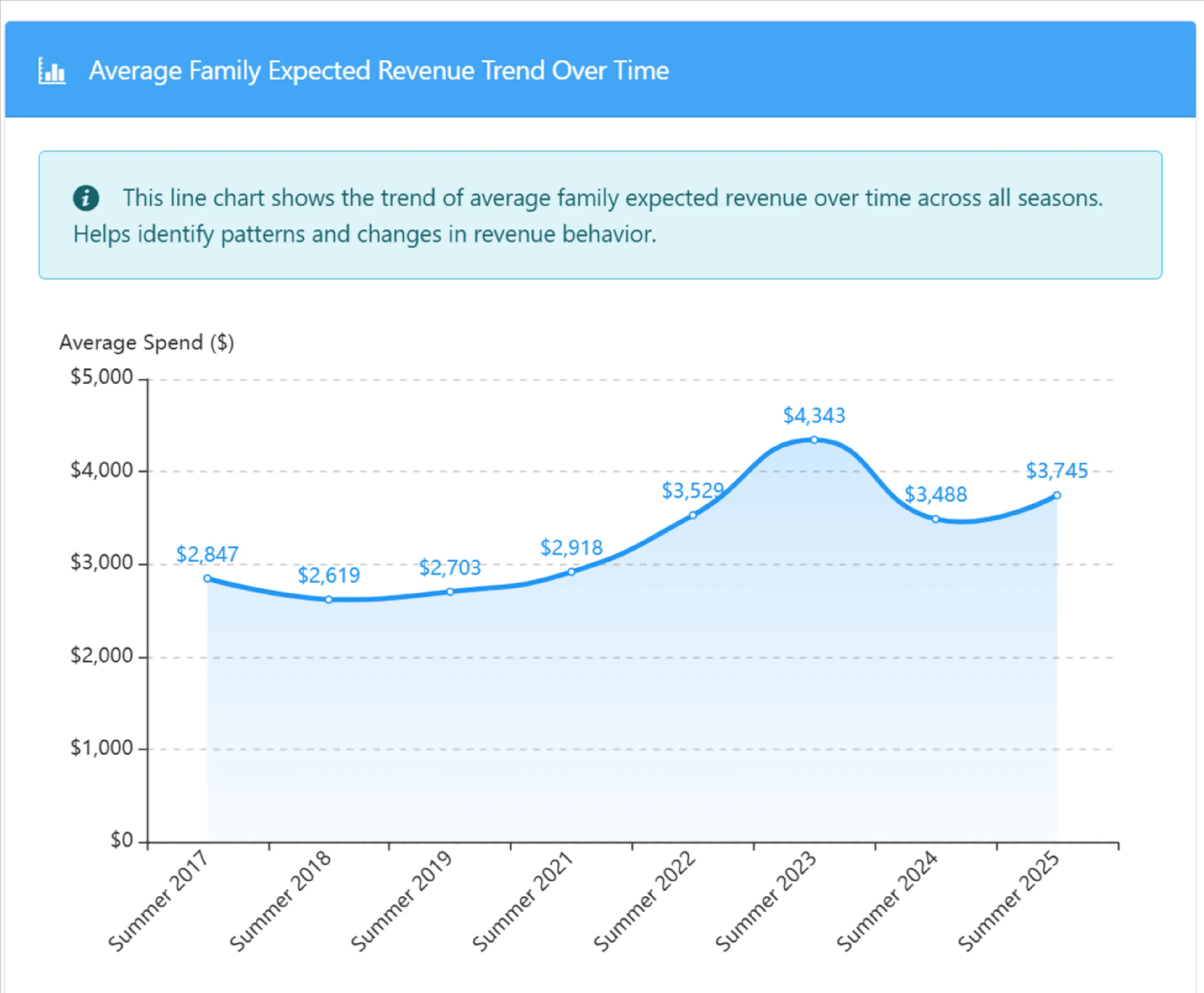 Track how much each family is expected to spend per season, review trends over time, and drill into specific families from the Average Family Expected Revenue report.