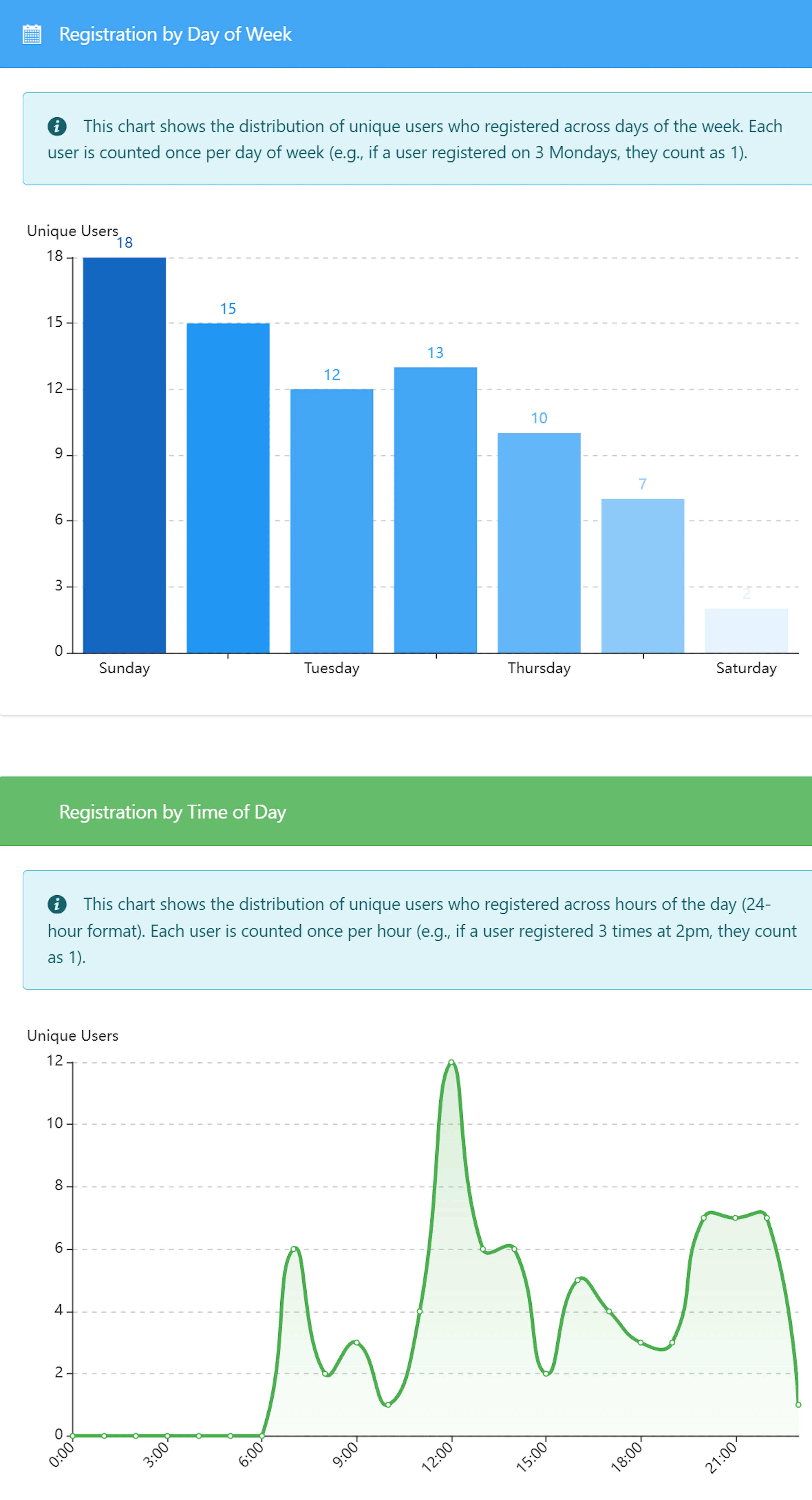Breaks registrations into time ranges (for example, morning, afternoon, evening) so you can see the busiest times.